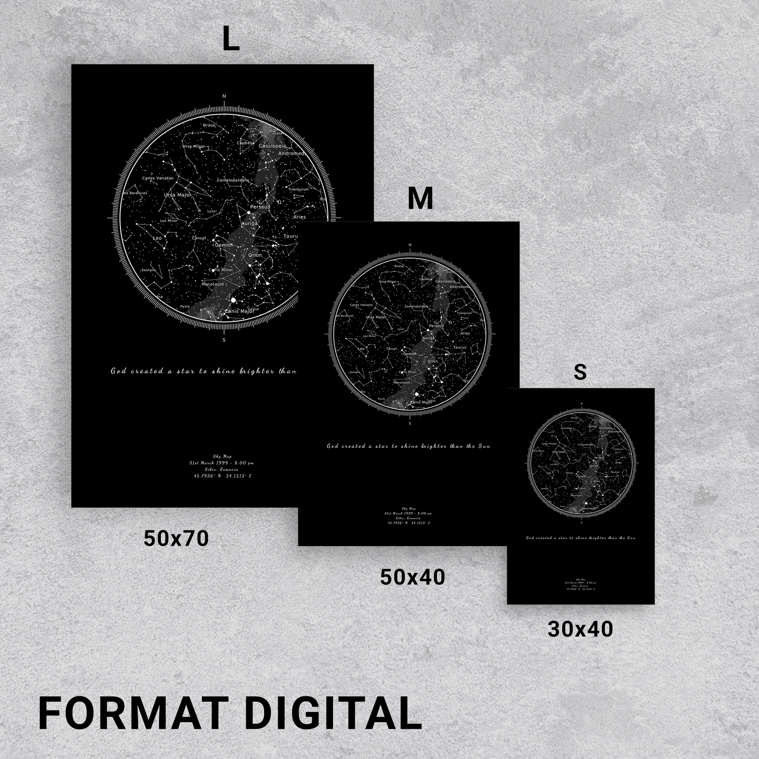 Oferim o varietate de dimensiuni si preturi pentru hartile noastre stelare. Preturile variaza in functile de dimensiunile tablourilor si de tipul acestora.
