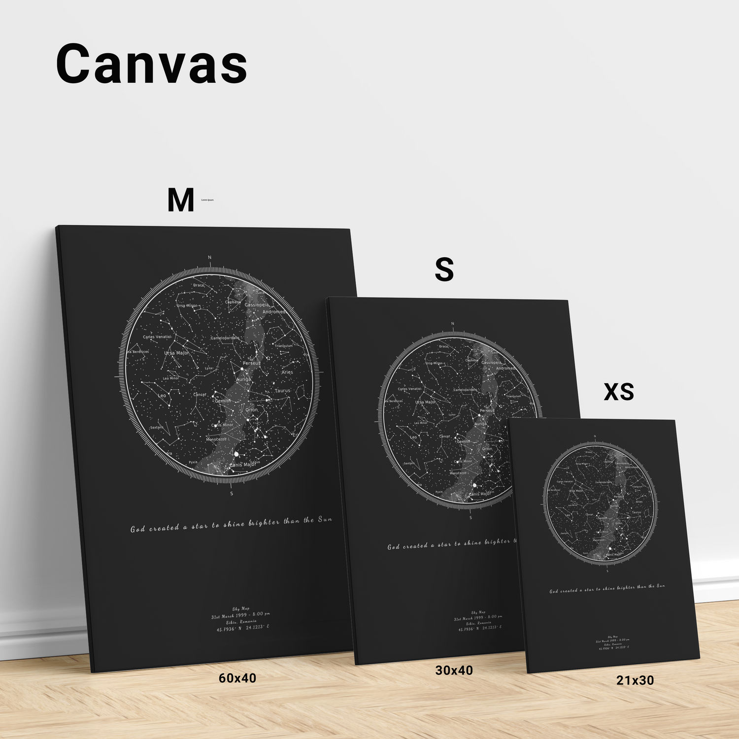 Transforma-ti harta stelara intr-o opera de arta. Toate printurile noastre pe panza sunt unice și originale, realizate manual. Textura panzei intensifica aspectul si senzatia naturala a hartii stelare.
